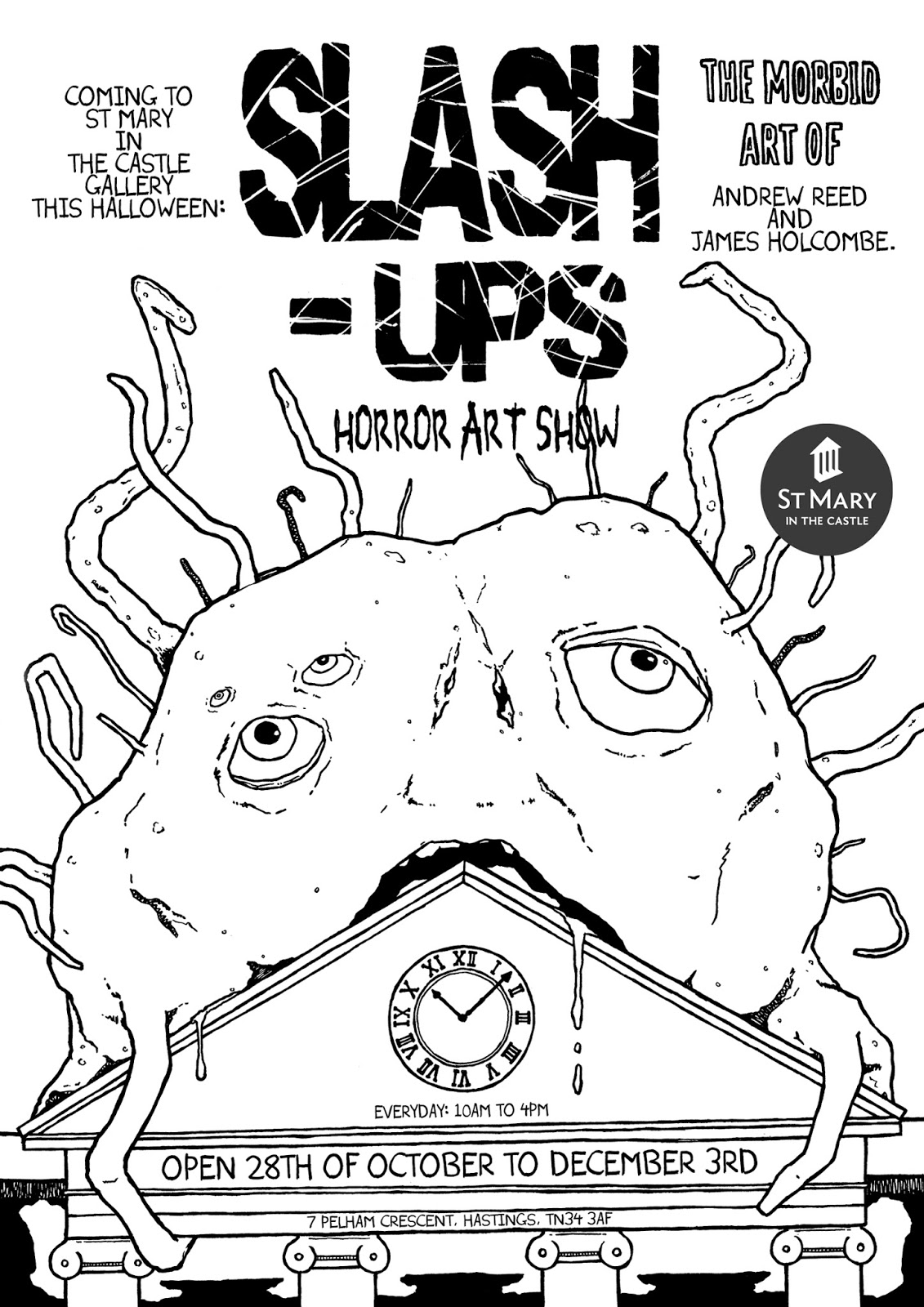 It’s come as a bit of a surprise, but I’m happy to say myself and James were approach very recently about putting on a SLASH-UPS theme horror art show by the St Mary In The Castle Gallery. We had been planning on doing something SLASH-UPS related for this Halloween, so when the offer of a show came along, it just seemed too perfect to pass up.
